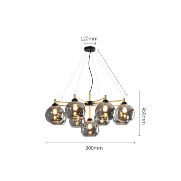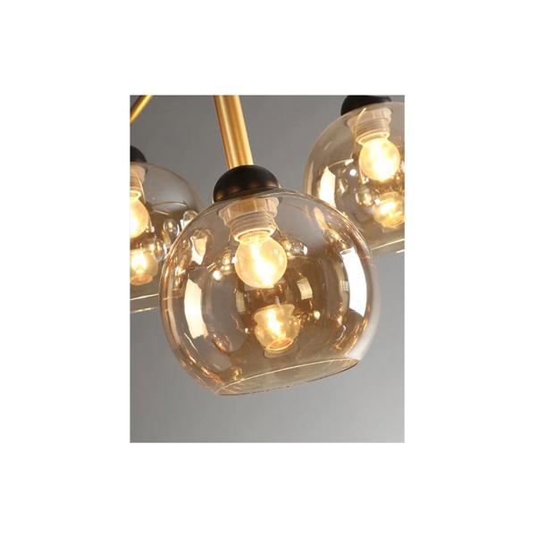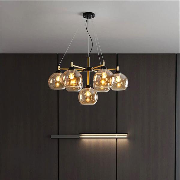 Lustră suspendată ce îmbină eleganța clasică cu un design modernist. Cu o configurație de 7 globuri de sticlă transparente, suspendate la înălțimi variate de o bază metalică cu finisaj negru mat și accente de aur, această piesă de iluminat este o expresie a rafinamentului. Fiecare glob adăpostește o sursă de lumină, emițând o lumină caldă și ambientală care poate adăuga o notă de intimitate și căldură oricărui spațiu. Ideală pentru a fi plasată deasupra unei mese de dining sau a unui bar, această lustră nu numai că oferă iluminare adecvată, dar devine și un punct focal stilistic în designul interior.