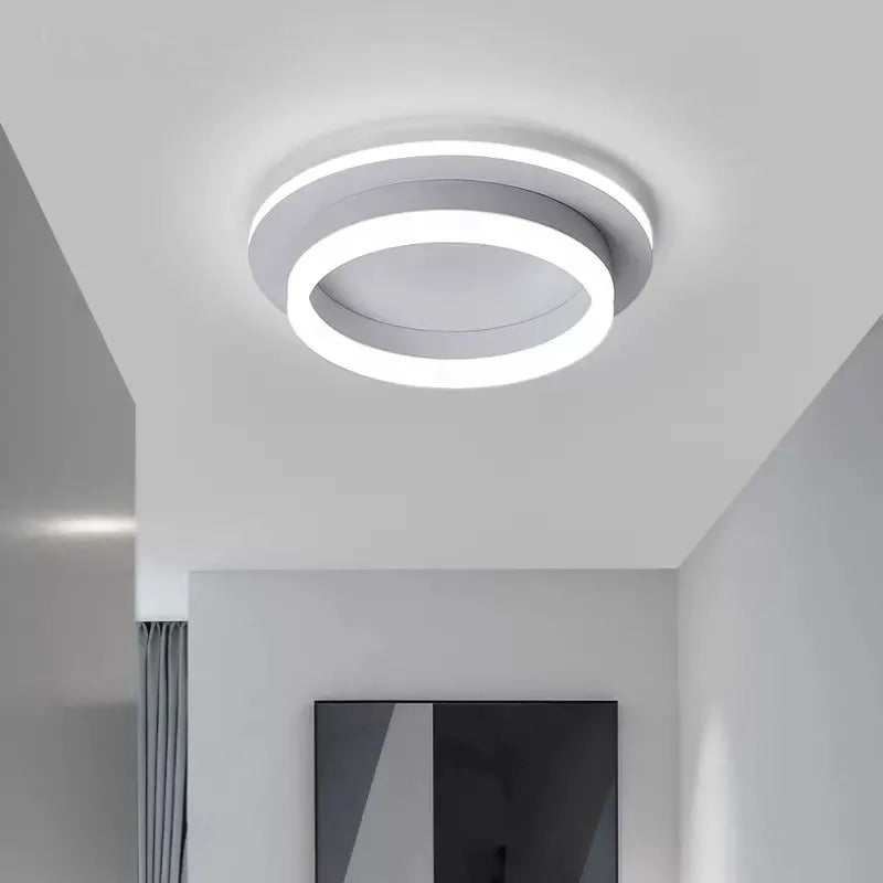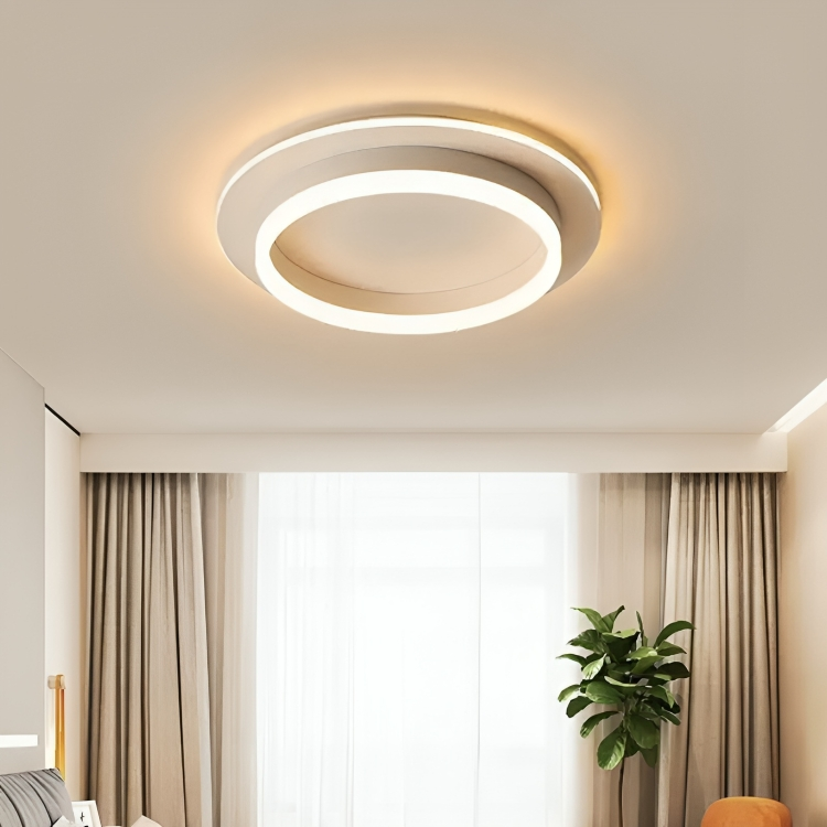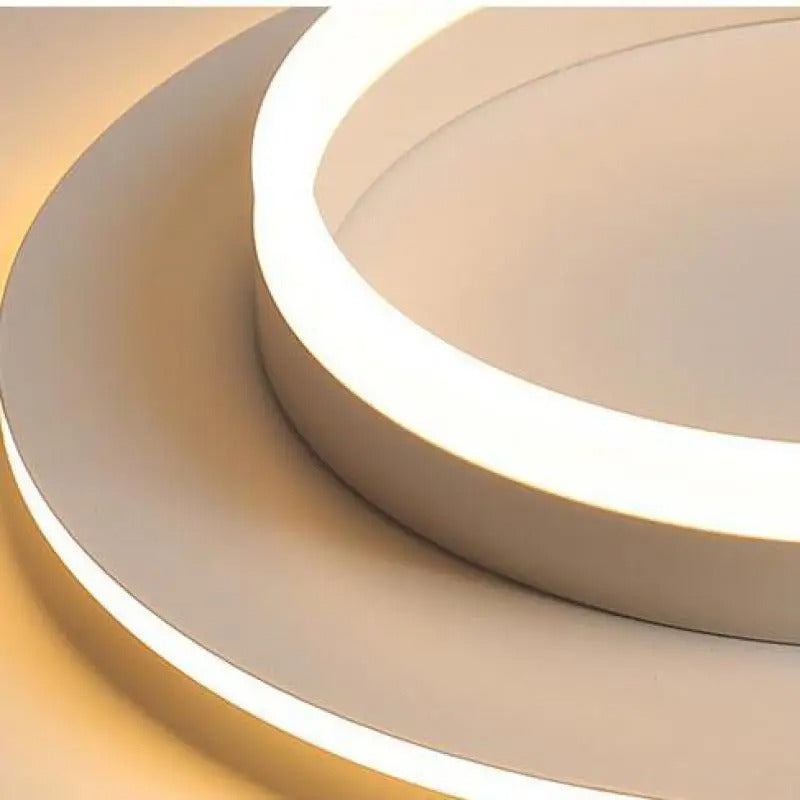 Lampă LED Modernă, Alb, 25cm x 9cm – Perfectă pentru Iluminarea Interiorului Dormitoarelor sau Birourilor cu Stil Nordic, această lampă de plafon adaugă o notă de eleganță contemporană oricărui spațiu. Designul său se bazează pe două cercuri concentrice – unul mare și unul mic – care creează un efect vizual de profunzime, oferind o atmosferă plăcută și modernă. Cercul exterior emite o lumină caldă, iar cercul interior cu margini mai subțiri adaugă un contrast subtil, dar elegant.