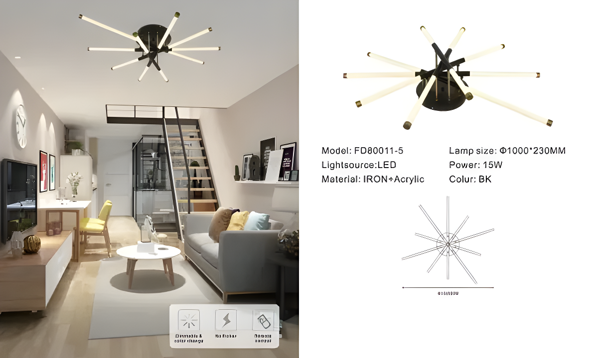 Fabricată din metal și acril, lustra se integrează perfect în orice tip de decor modern, aducând un accent elegant și funcțional în livinguri, birouri, dormitoare sau alte camere de interior. Datorită celor 3 tipuri de lumină, aceasta poate fi ajustată pentru a crea atmosfera dorită. Telecomanda inclusă asigură un control rapid și convenabil, iar designul său rafinat adaugă un plus de stil oricărei încăperi.